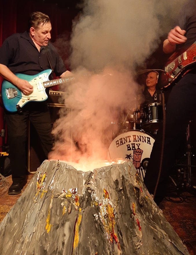 De Kilauea is een actieve vulkaan op Hawaii en The Kilaueas is een surfgroep uit Berlijn die een mini vulkaan gemaakt uit beschilderd karton, een rookmachine en rood licht op het podium plaatsen. Onderweg naar Sint Niklaas waren ze gesideswiped door een vrachtwagen maar daar kwamen ze gelukkig met de schrik vanaf. Omdat de verhuurfirma niet over de brug kwam besloten ze gewoon verder te rijden met hun beschadigde wagen, zodat wij samen met Jimmy Dale op de eerste rij konden genieten van het mooie samenspel tussen twee leadgitaren en een uitdrukkingsloze bassist die leek te slapen maar toch zijn werk deed in nummers als Born Dead Buried Alive, The Last Song, The Dark Wave Smells, Meteora, Scouting en Rockets, logischerwijs geconcentreerd op hun recentste releases, het droevige wat Shadows-achtige Back From Katonga, en de spy surf van The Twang Files. Samengevat: staccato surf en de surfste Istanbul ooit, een van de twee covers die ik herkende. De andere was Bikini Drag van The Pyramids, ook gecoverd door The Phantom Surfers. Gitarist Ralf Hermanutz ging om de haverklap met zijn gezicht in hun vulkaan hangen om diepe halen rook te happen. Beter dan vapen?