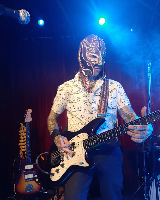 Achter de maskers van Los Straitjackets (USA) verborgen zich Chris "Gringo Starr" Sprague op drums, Pete Curry op basgitaar, en op gitaar Eddie Angel én diens zoon Simon Heeran alias El Niño. Zoonlief speelt zelf ook leadgitaar in een southern rock band genaamd Wasted Major en nam vanavond heel wat solo’s voor zijn rekening, bijvoorbeeld in Jet Set, Love Potion # 9, Out Of Limits en High Wire Act, het enige nummer van hun gloednieuwe Somos Los Straitjackets, hun eerste album met enkel nieuwe nummers in meer dan dertien jaar. Simon leerde het van de meester en de opvolging is verzekerd, da's duidelijk. Het surfbal opende met het melodieuze Pacifica en er staken natuurlijk een aantal typische Eddie Angel instros in als Outta Gear. Wat me al verschillende keren is opgevallen stelde ik ook vanavond vast: live zijn Los Straitjackets een pak harder dan op geluidsdrager waarop ze vaak richting easy listening gaan. Naast surf classics als It's Monster Surfing Time, Squad Car en Batman gekoppeld aan Wipe Out was er ruim plaats voor eigen klassiekers als Casbah, Kawanga, Calhoun Surf, Tempest en Rockula. Het feest en gelijk het hele festival eindigde met een supersnel Surfin' Bird/The Bird's The Word gezongen door Chris Sprague. Geweldig ook die choreografieën, al gaat Pete Curry niet meer door de knieën. Volgend