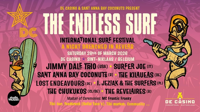 Wij kunnen niet verder zwemmen dan tot aan de overkant van een glas whiskey, maar dat weerhoudt ons er niet van om een flinke boon te hebben voor surfmuziek. Dit gezegd zijnde moet ik daar onmiddellijk bij bekennen dat ik moeite heb om die duizenden instrumentals van honderden surfbands van elkaar te onderscheiden, laat staan dat ik de titels ervan kan onthouden. Oud worden, het doet een mens geen goed. Via Roddelgem, Vergezochtegem, Klotegem, Cacdorp en Naardeklotebeke begaven we ons naar De Casino in Sint Niklaas aan de andere kant van het water om ons te laven aan de instrumentale bron bij de eerste editie van The Endless Surf, festival met zo maar eventjes acht surf bands op de affiche. Zou zo'n overdosis surf niet teveel van het goede zijn? Een paar honderd aanwezigen uit België, Nederland, Frankrijk, Duitsland, Italië, Zwitserland, Denemarken en Spanje hadden hetzelfde idee, dus neem van mij aan dat het een gezellige internationale boel was die de internationale affiche met bands uit België, Nederland, Frankrijk, Italië en Duitsland weerspiegelde.